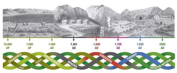 Así, se identifican evidencias de grupos cazadores, recolectores, con y sin cerámica, agricultores, pastores, incas y huarpes; grupos originarios bajo el régimen colonial que circularon entre las vertientes en el contexto de las exploraciones (año 1551) y fundación de la Ciudad de Mendoza; emplazamientos, piques, minas y caminos como expresiones de la actividad minera; corrales y sendas como testimonios de la actividad ganadera; y la actividad turística impresa en el paisaje a través de hospedajes, servicios, representado hoy por el Hotel Villavicencio, ícono de la Reserva y de la marca de agua mineral.